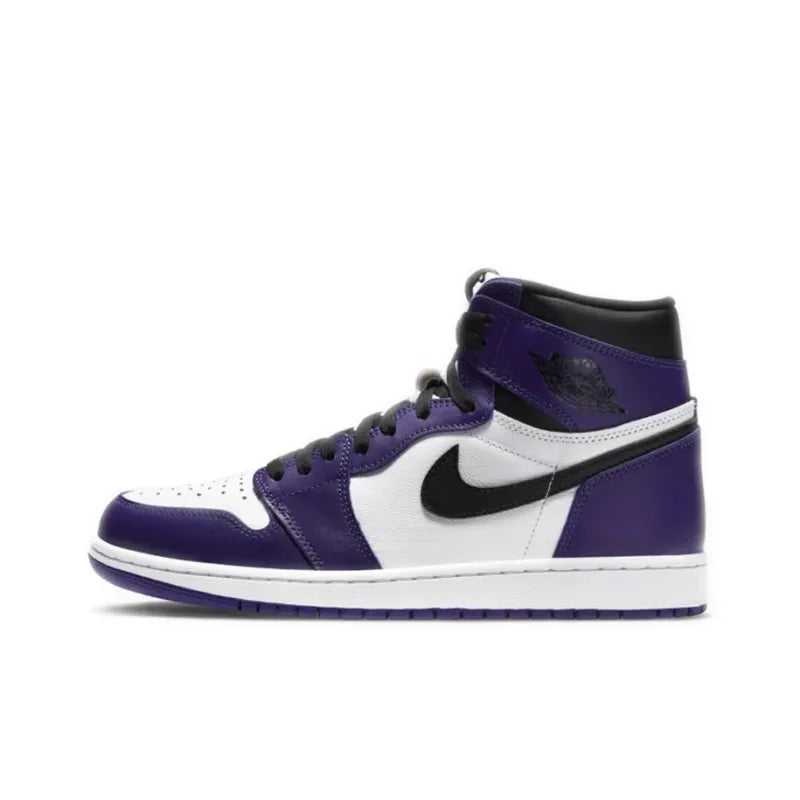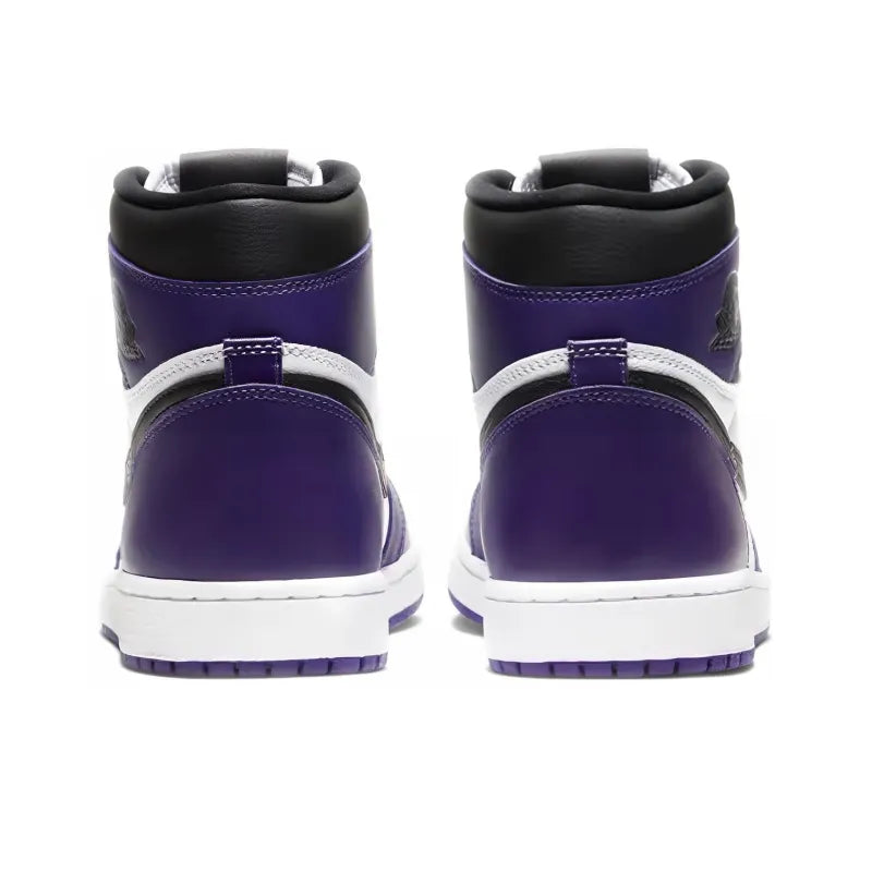 This Jordan 1 consists of a white leather upper with Court Purple overlays and black detailing. A black Swoosh and Wings logo, white midsole, and Court Purple outsole completes the design.