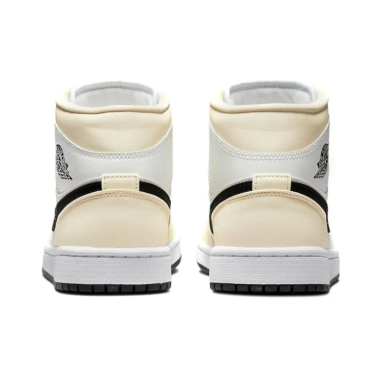 The Air Jordan 1 Mid Coconut Milk (Women's) starts off with a traditional white leather base, and continues with the addition of creamy overlays in the toe, eye stays, ankle and heel. Hits of black in the Air Jordan branding, Jumpman logo on the tongue, Nike Swoosh and outsole round off the minimalistic palette.
