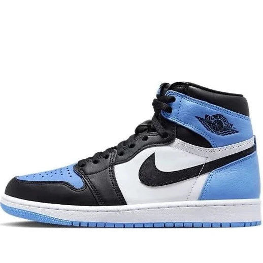 The Jordan 1 High OG UNC Toe showcases University Blue on the toe box and heel, which perfectly contrasts with the crisp White leather on the mid-panel and Black on the Swoosh and ankle collar. These kicks sit on a clean white midsole, offset by a vibrant University Blue outsole, creating an impressive visual balance.
