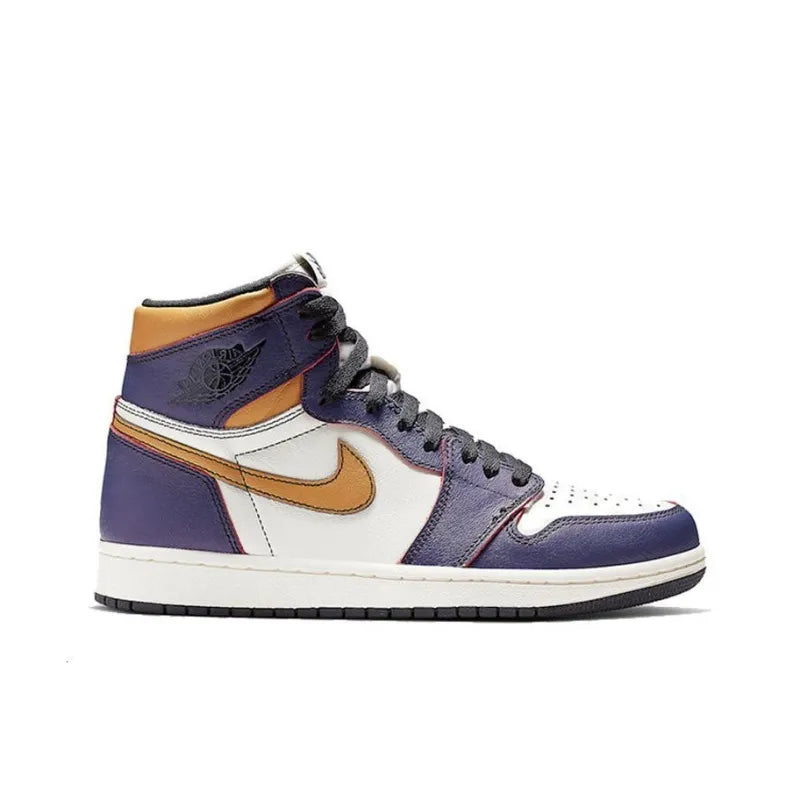 Drop some magic on the haters after copping the Jordan 1 Retro High OG Defiant SB Lakers. This AJ 1 SB comes with a white upper plus blue and yellow accents, yellow Nike "Swoosh", white midsole, and a black sole.