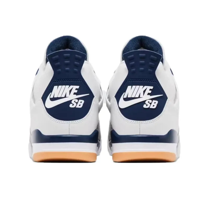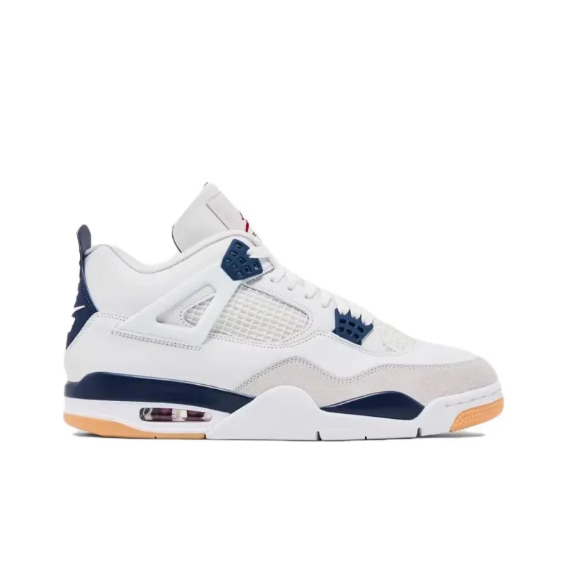 The Jordan 4 Retro SB Navy blends basketball heritage with skateboarding functionality, continuing the successful partnership between Nike SB and Jordan Brand. Following the hype of the "Pine Green" release, this edition swaps green for navy, adding a sleek and timeless twist to the SB-enhanced Air Jordan 4 silhouette. The upper features summit white leather with navy accents on the eyelets, heel tab, and midsole, delivering a clean yet bold aesthetic. A vibrant red Jumpman logo on the tongue and insoles provides a striking contrast, while the Nike SB branding on the heel cements this crossover’s skate-ready DNA.