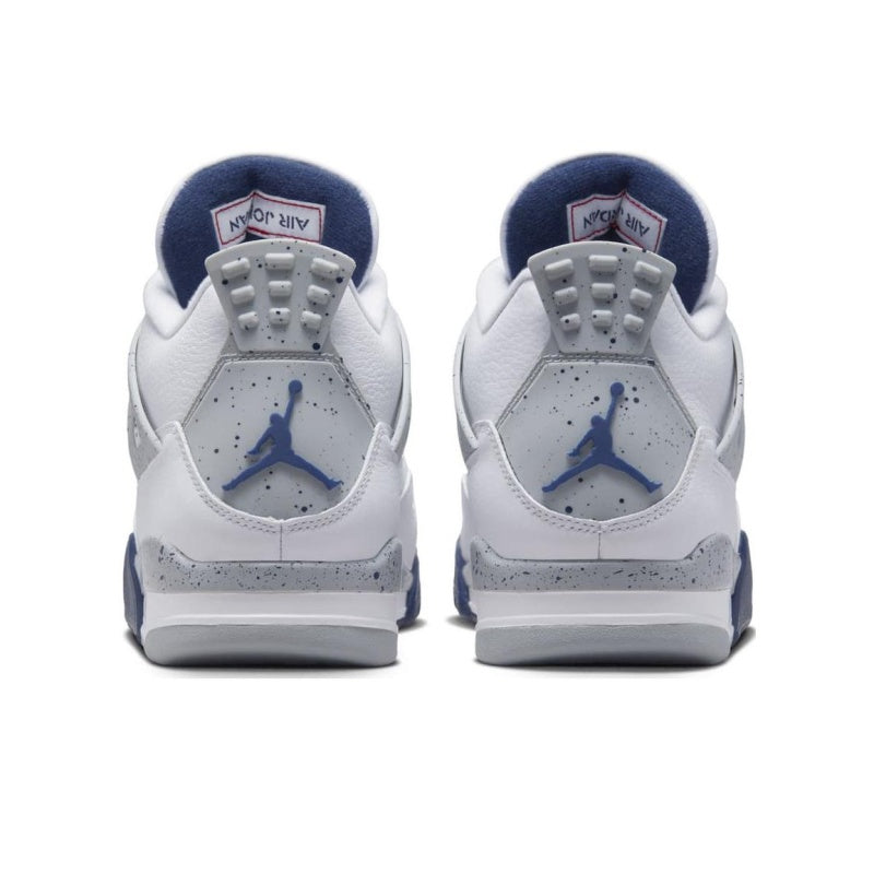 The Air Jordan 4 Retro White Midnight Navy dresses in white, midnight navy, and light smoke grey colorway