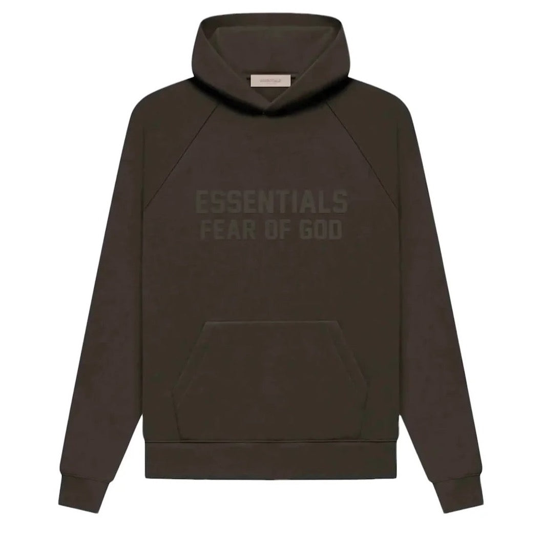 This solid color clothing apparel features an oversized fit, a kangaroo front pouch, an attached hood, long sleeves, ribbed cuffs, and a ribbed hem. On its chest, it features an imprinted Fear of God Essentials graphic inscription, while on its hood, it boasts a rubberized branding. For care, this off-black-colored hoodie should be hand-washed and then flat or line dried.