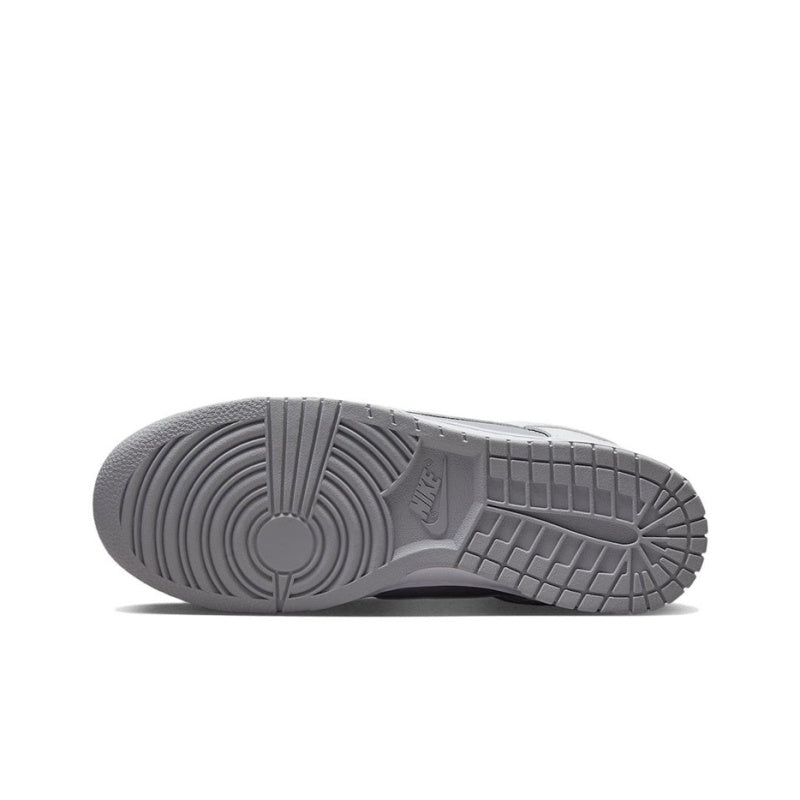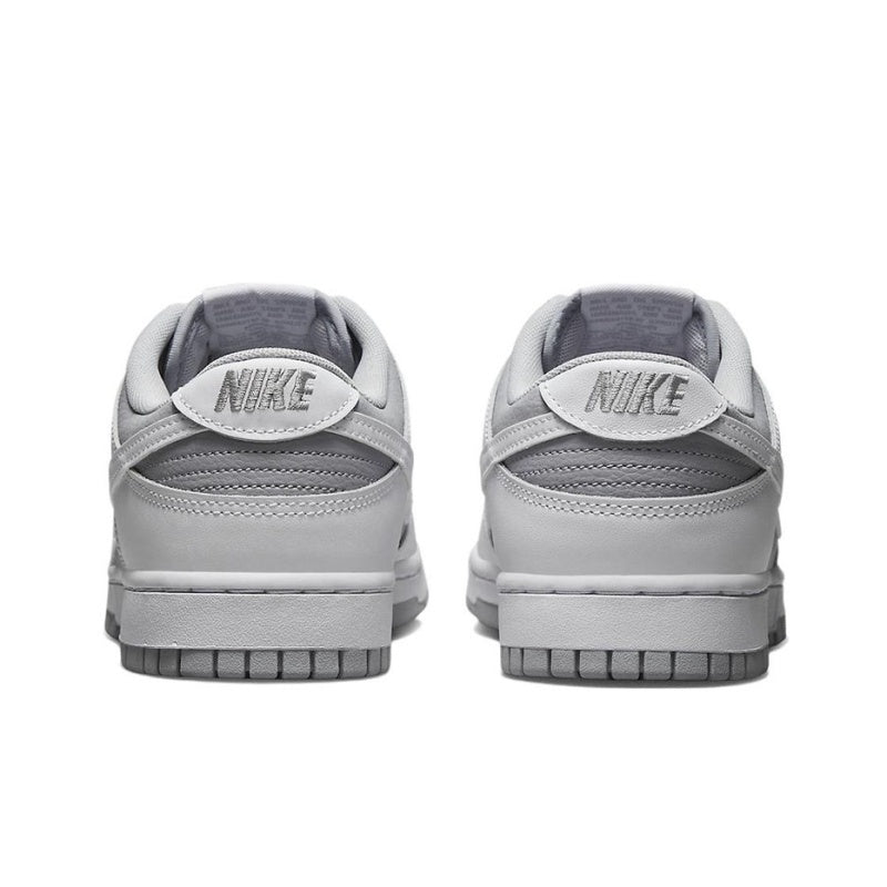 Dressed in a grey and white palette, this shoe features a leather upper with white overlays, laces, Swoosh emblem, and midsole. The grey color is highlighted on the rubber outsole, the woven Nike tongue tag, and the linings. Additional Nike branding can be found on the padded sockliner and heel tab. This Dunk Low rests on a rubber cupsole with the trademark traction pattern.