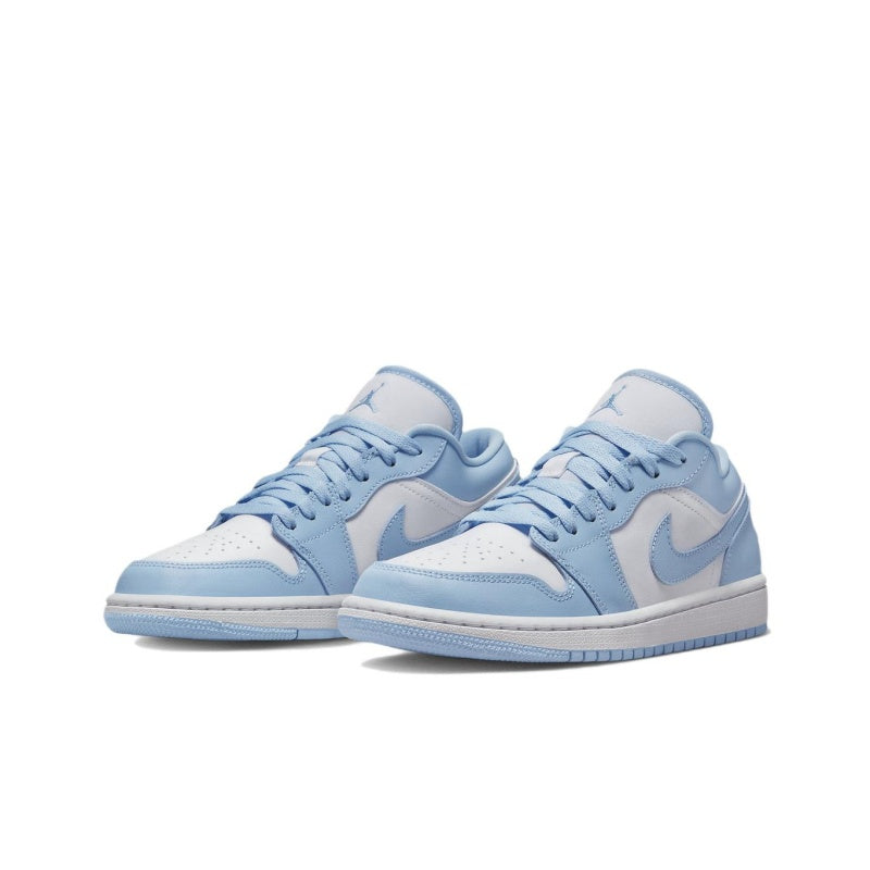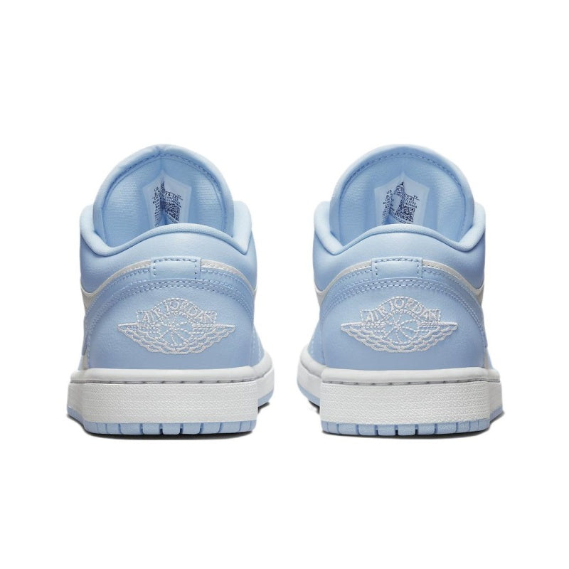 This Low Air Jordan 1 for women comes in white and aluminum colorway. The sneaker has a white leather base featuring sky blue leather overlays.. The sneaker has a white midsole and a light blue outsole with a repeat color of the upper, and the Wings logo on the heel. The show has an AIR-encapsule technology unit on its sole for cushioning.