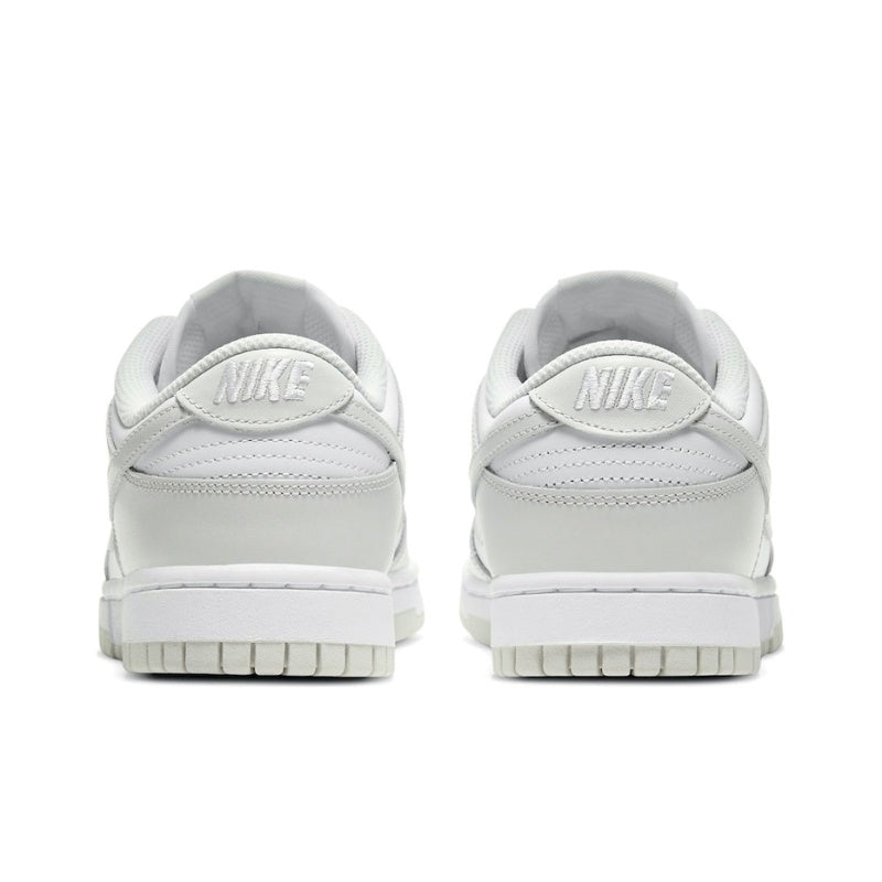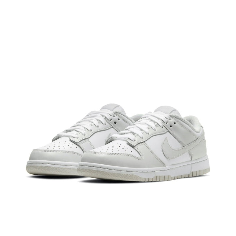 The women's Nike Dunk Low Photon Dust (W) is made of white leather with Photon Dust leather overlays and Swooshes. A woven Nike label on the tongue and embroidered Nike branding completes the design