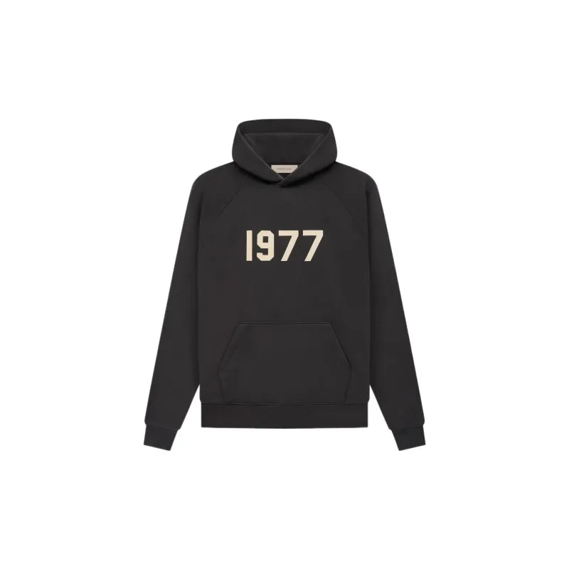Delivered as part of the first delivery of Fear of God Essential's Spring/Summer 2022 collection, this Iron-colored Fear of God Essentials 1977 Hoodie was made available in two different colors. The hoodie is made from a heavyweight cotton, polyester blend and features a velvety flocked 1977 logo on its chest and a rubberized logo on its hood.