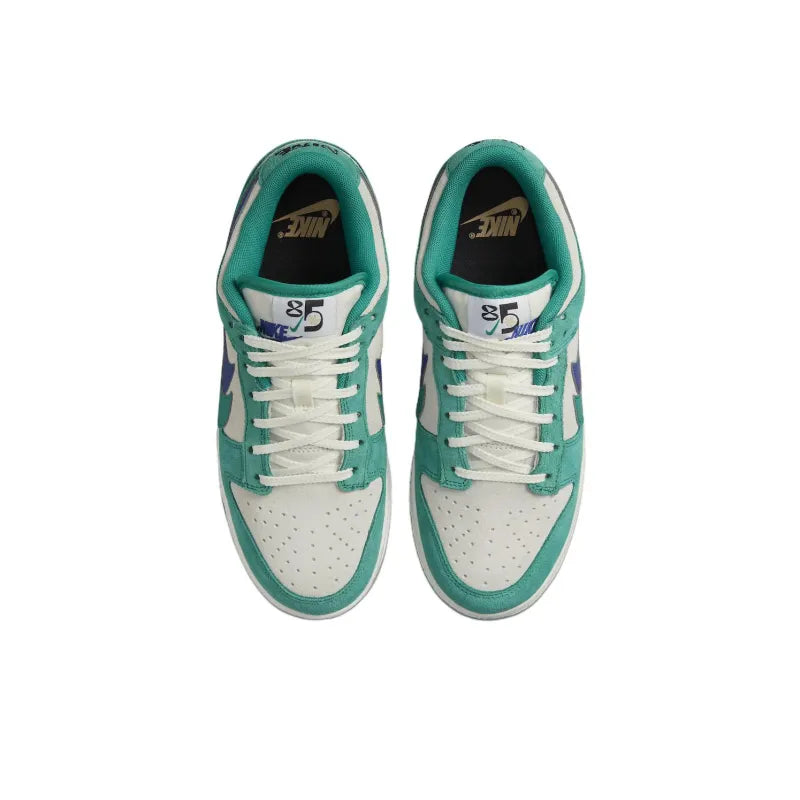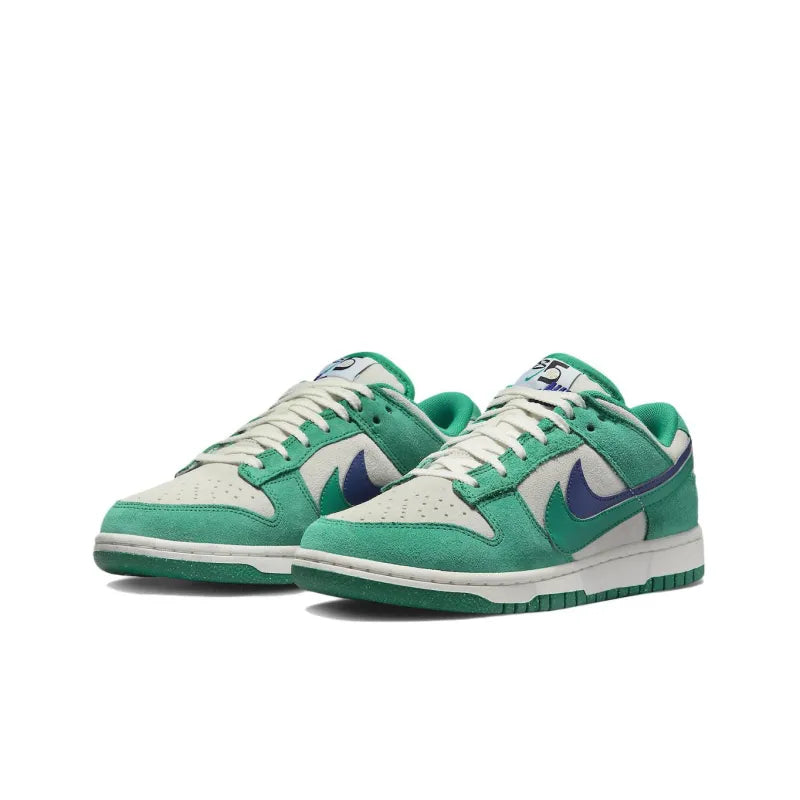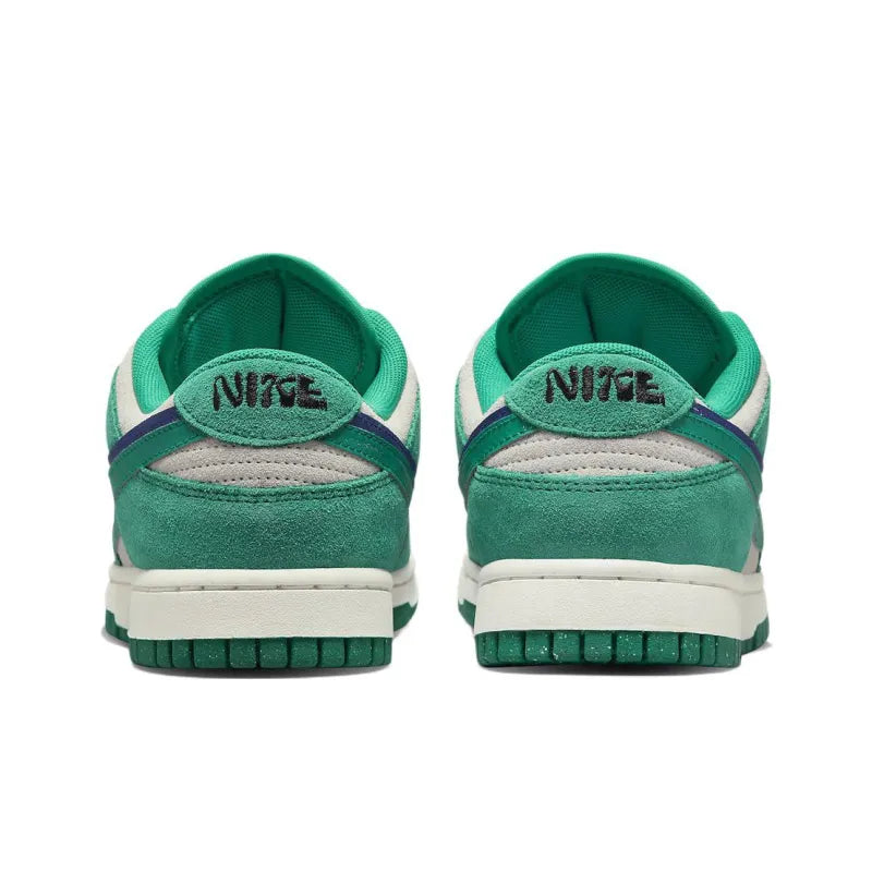 The sneakers are dressed in Sail, Lapis, Off Noir, and Neptune Green colors. The shoes have a beige suede base with green suede inserts, drawing originality from the green and navy leather double-side Swoosh. The shoes also have beige midsoles and green Nike Grind outsoles.