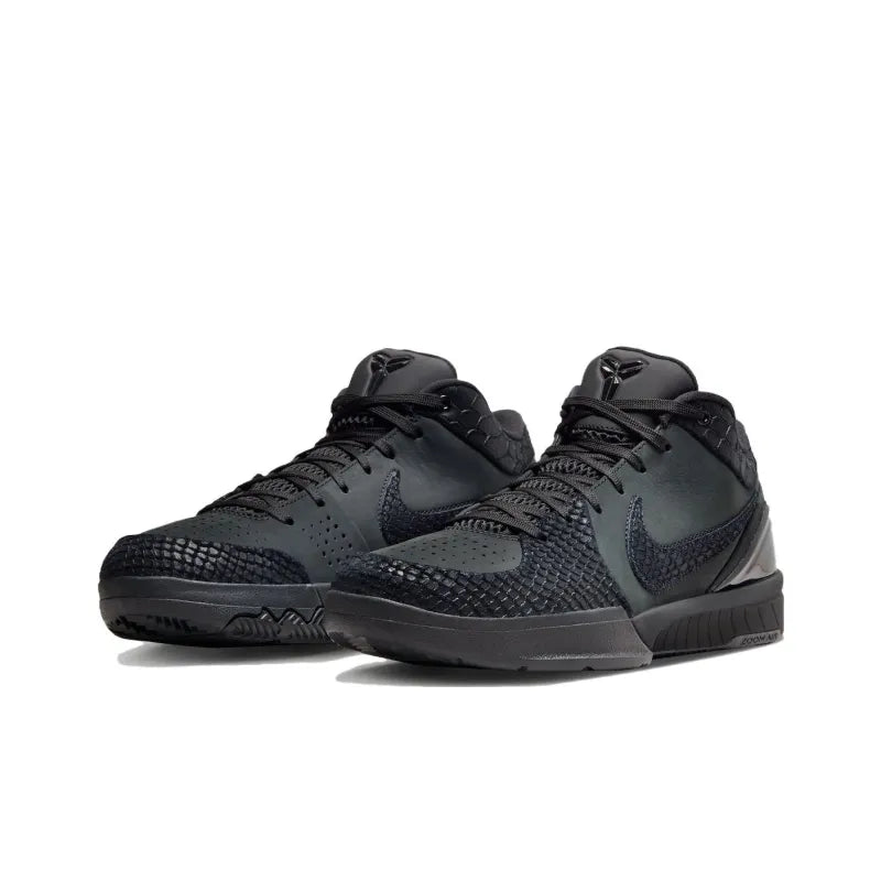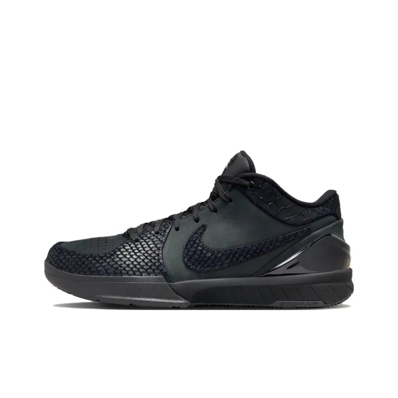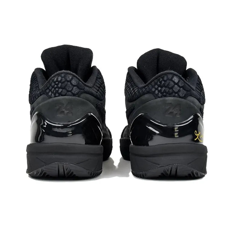 The Nike Kobe 4 Protro Gift of Mamba emerges in a striking Black/Black-University Gold colorway, showcasing a perfect blend of luxury and performance. The upper is crafted from light black suede, complemented by a faux snakeskin pattern on the mudguard, collar, and Swoosh, adding a touch of elegance and edge.