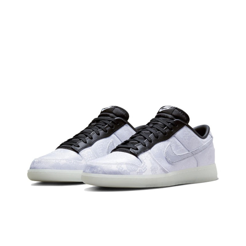 The magic doesn't end there. Unveiling a tearaway silk upper, it showcases an intriguing array of iconography weaved throughout the fabric. It's a fresh take on the Dunk Low by CLOT and Fragment Design. This sneaker isn't just a fashion statement; it's a story waiting to unfold. As you walk, the silk upper gradually wears away, revealing a custom design that's yours and yours alone. This pair of Dunks also comes with extra blue laces. It's time to make your mark with the Nike Dunk Low CLOT Fragment White.