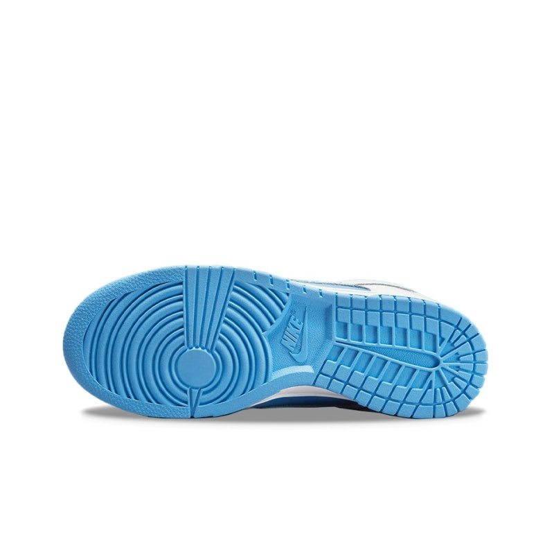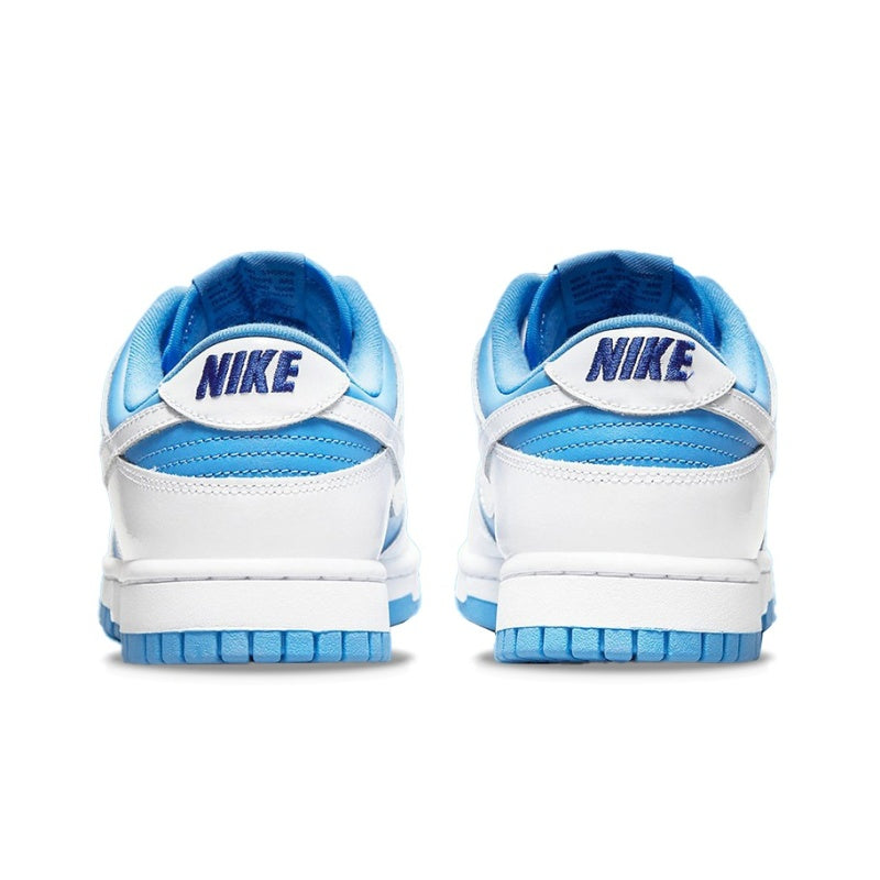 The base color is white, with bright blue details layered on top. The swoosh symbol is made from white leather. There are perforated holes on the bright blue toe box. White laces can be found on top of a blue tongue that has blue detailing, including the Nike logo.