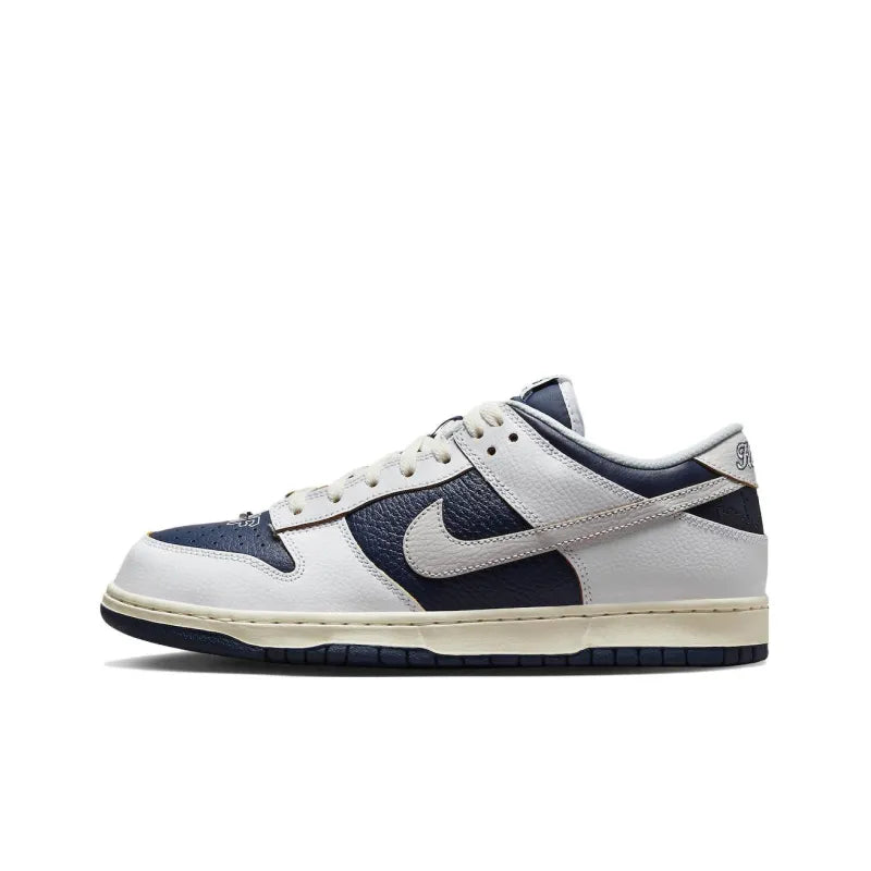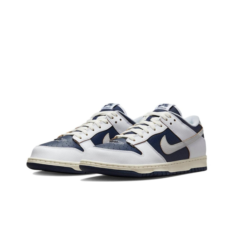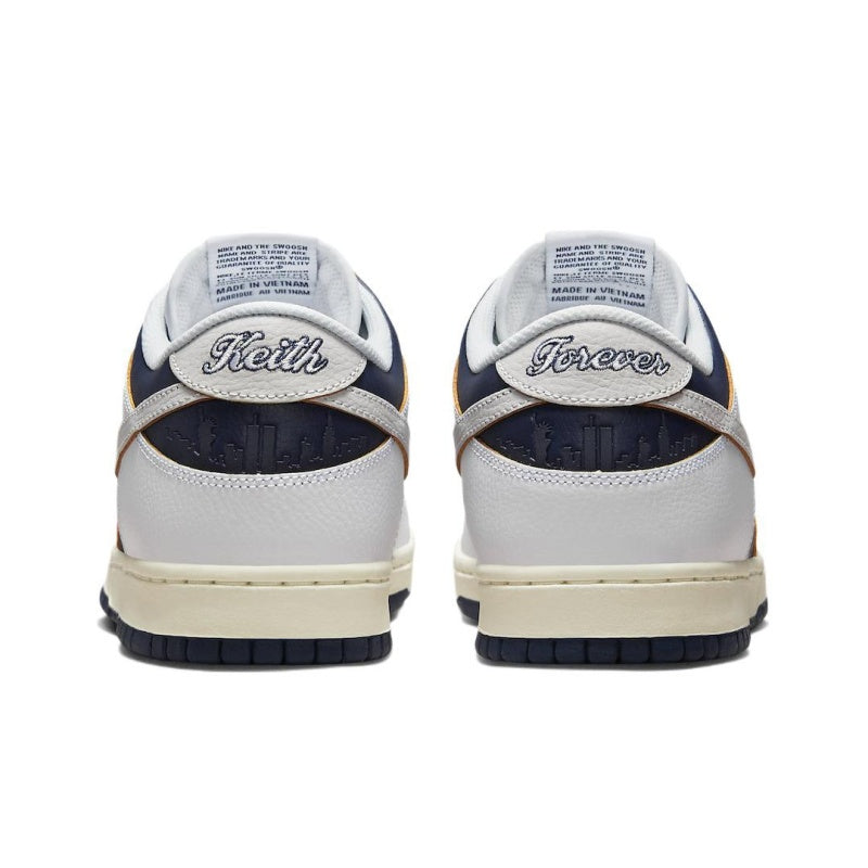 This Low SB Dunk model by Nike comes with a "cut and peel" system on the navy blue tumbled leather quarter panel on the lateral side that reveals blue and white tie-dye canvas. The NYC skyline on the heel glows in the dark. It also includes embroidered heel tabs, a perforated toe box and an inscription that reads "Forever" in the rear section.