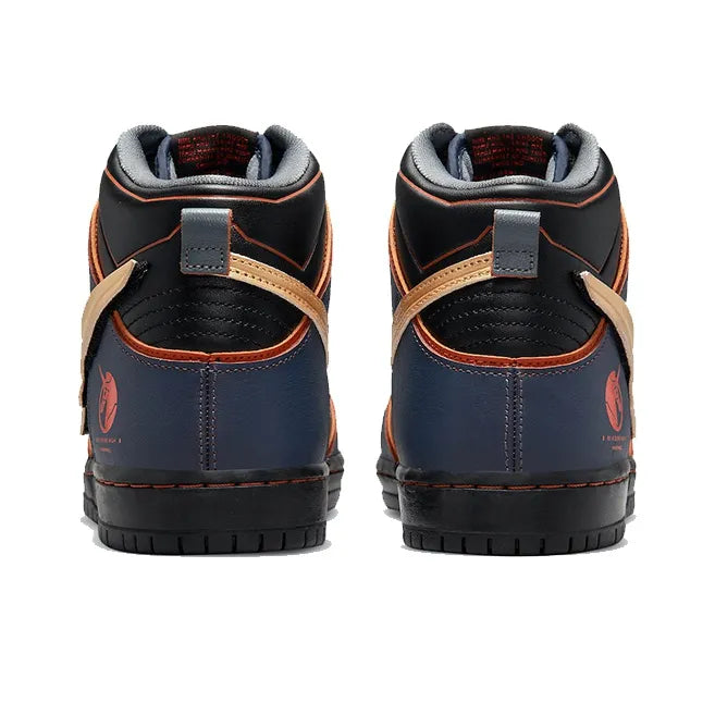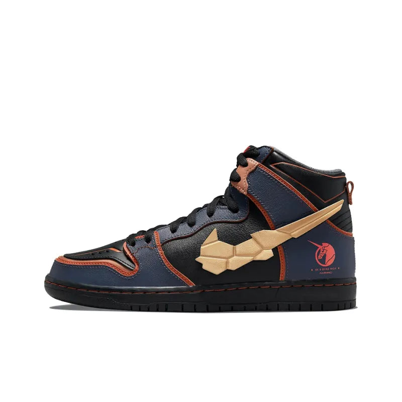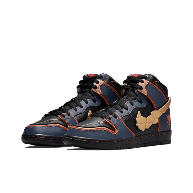This SB High Nike Dunk uses a metallic black and blue-grey base, which is supplemented by some detailing in a blaze of orange. The thunder blue upper of this shoe is complemented by mecha-like details at the collar and the toebox. This sneaker comes in different sizes and colors. A black sole and lacing system complete the design.