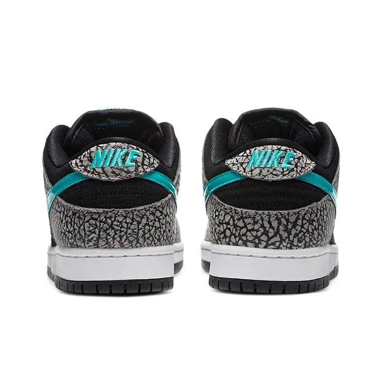 The Nike SB Dunk Low atmos Elephant features a white leather and black nubuck upper with Cement Grey Elephant print overlays and a Clear Jade Swoosh. A padded SB tongue, Elephant print heel tab with Nike embroidery, white midsole, and black outsole complete the design.