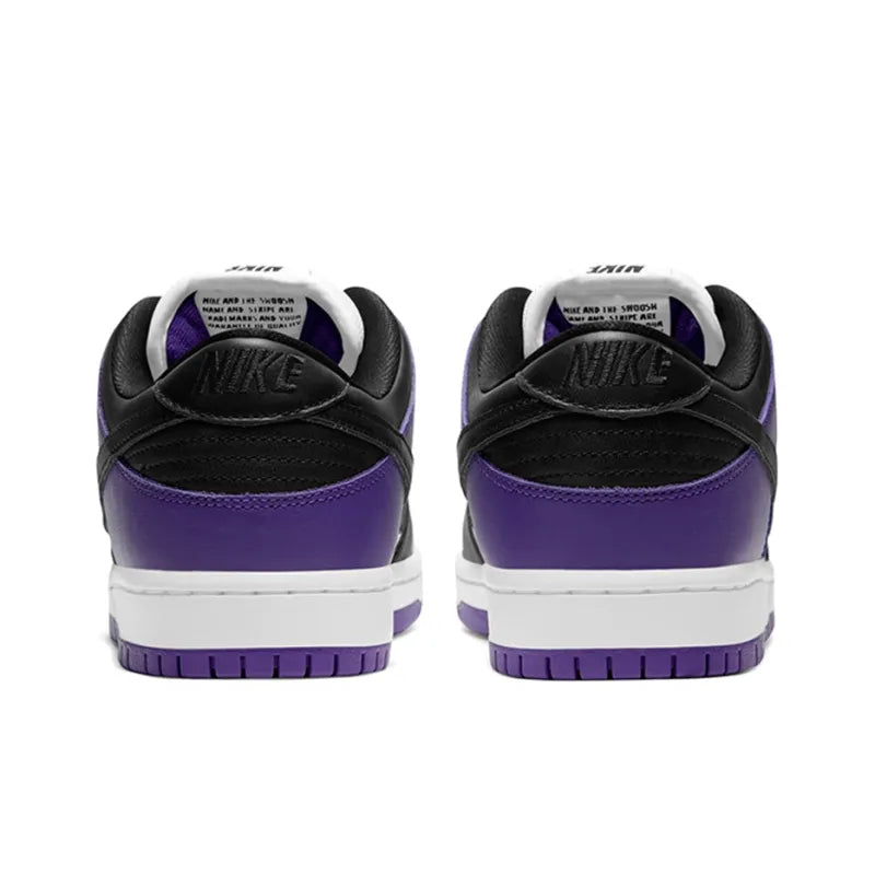 This skateboarding (SB) Nike SB Dunk Low Court Purple delivers a straightforward colorway of the classic silhouette. The Nike SB Dunk Low Court Purple uses a white leather upper with contrasting black overlays on the forefoot, eyestay, and collar. Court purple makes its appearance on the heel overlay, which is matched by the rubber outsole that features a grippy traction pattern originally designed for basketball courts. A Zoom Air unit in the heel and a padded tongue are included for maximum comfort.