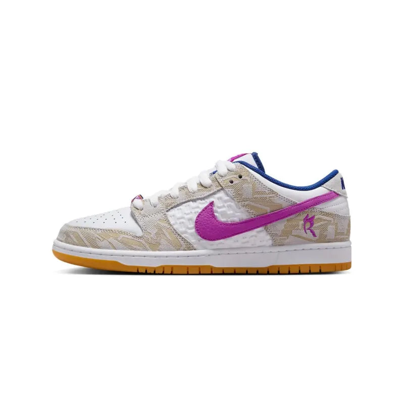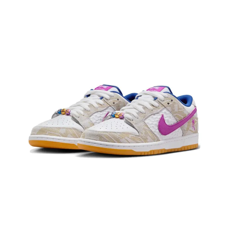 The Nike SB Dunk Low Rayssa Leal is a vibrant homage to the Brazilian skateboarding sensation, showcasing a color palette that reflects her youthful energy and spirited personality. Pure platinum, deep royal blue, vivid purple, and white converge with gum yellow accents to create a sneaker that's as dynamic and captivating as Rayssa Leal herself. This edition of the SB Dunk Low is designed for those who live their life on and off the skate ramps with passion and style.