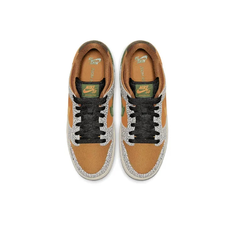 This Nike SB Dunk Low consists of a canvas and suede upper with leather Safari printed overlays. Green detailing, Swoosh branding on the mudguard, and a gum outsole completes the design.