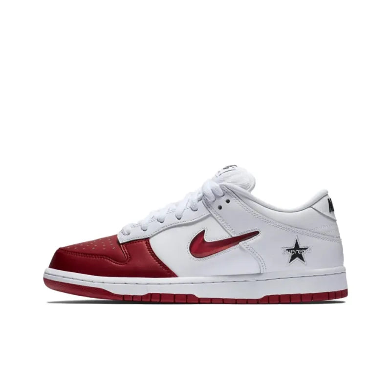 After dropping at Supreme flagships, the exclusive Supreme x Nike SB Dunk Low Pack in “Metallic Silver,” “Metallic Gold” and this “Varsity Red” colorway has dropped once again today. This red version dons the hue across its shiny leather toe box and mini jewel Swooshes on the sides, while white covers the remainder of the upper. Finishing touches include a Supreme star logo on the lateral heel, followed by a white midsole, red outsole and custom Supreme-branded insoles.