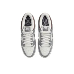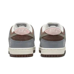 The Yuto Horigome Nike SB Dunk Low features a Sail leather upper, strengthened with Wolf Gray suede overlays on both the front and rear portions. It includes a leather Swoosh in a unique Iron Gray shade, and the branding elements consist of a double-feather graphic on the lateral heel. Additionally, 'Y uto Horigome' is prominently displayed on the tongue tag, denoting his association with Nike SB. The pink suede back tab is adorned with an embroidered Nike wordmark, creating a striking contrast with the low-cut padded collar made from brown suede. The sneaker's foundation is firmly supported by a sturdy cup sole.
