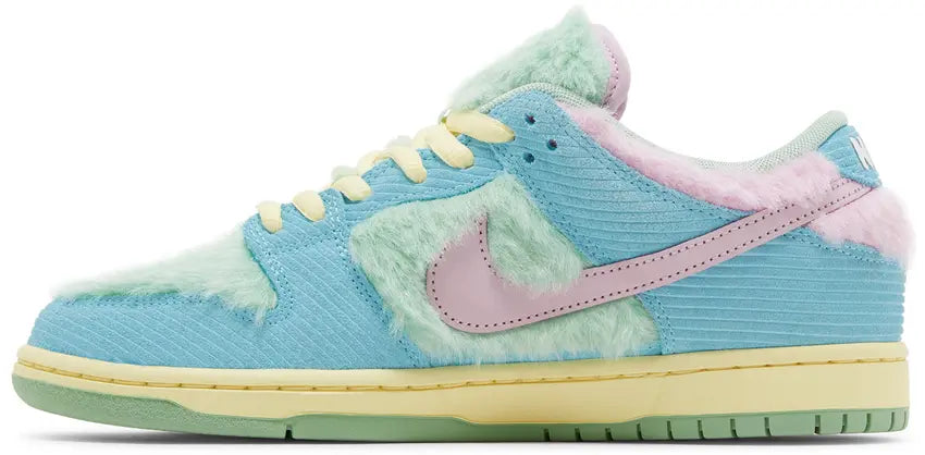 The SB Dunk Low Verdy “Visty” brings the colorful world of Verdy’s beloved character Visty to the iconic Dunk silhouette. Featuring a pastel mix of pink, blue, green, and yellow panels, this sneaker radiates playful energy while staying true to SB Dunk heritage with premium suede overlays and durable construction.