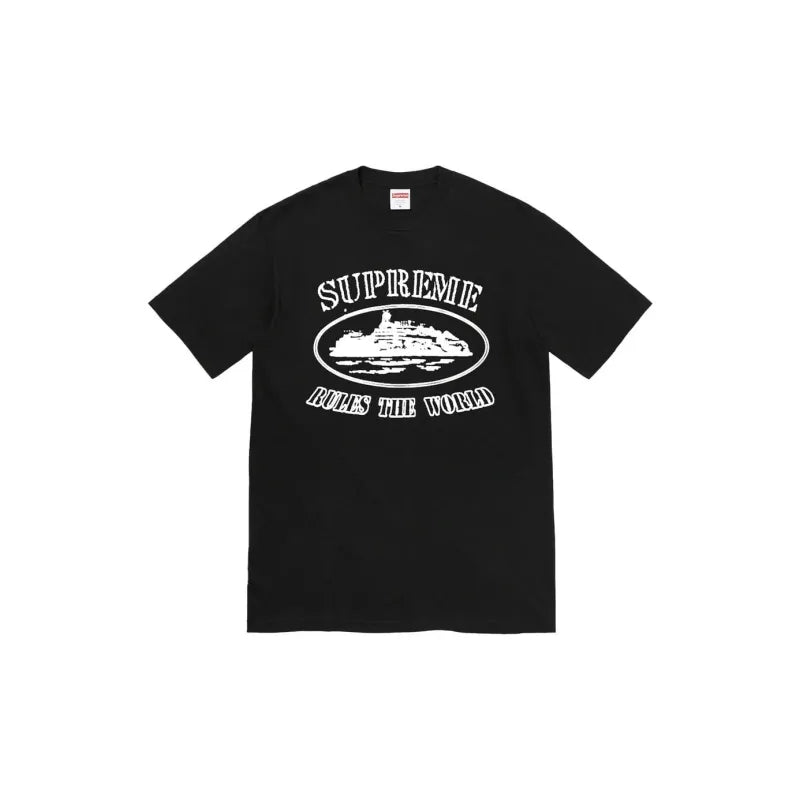 This Supreme / Corteiz Rules The World Tee Black released as part of Supreme FW23 Collection December 21, 2023. This Tee marks the first time Supreme and Corteiz have collaborated. Made from all cotton this Supreme / Corteiz Rules The World Tee is has a printed graphic on the front "Supreme Rules The World" a playful nod to the London's label usual "Corteiz Rules The World" tagline. The back printed graphic is a poem by John Donne "No Man Is An Island" in a handwritten text.