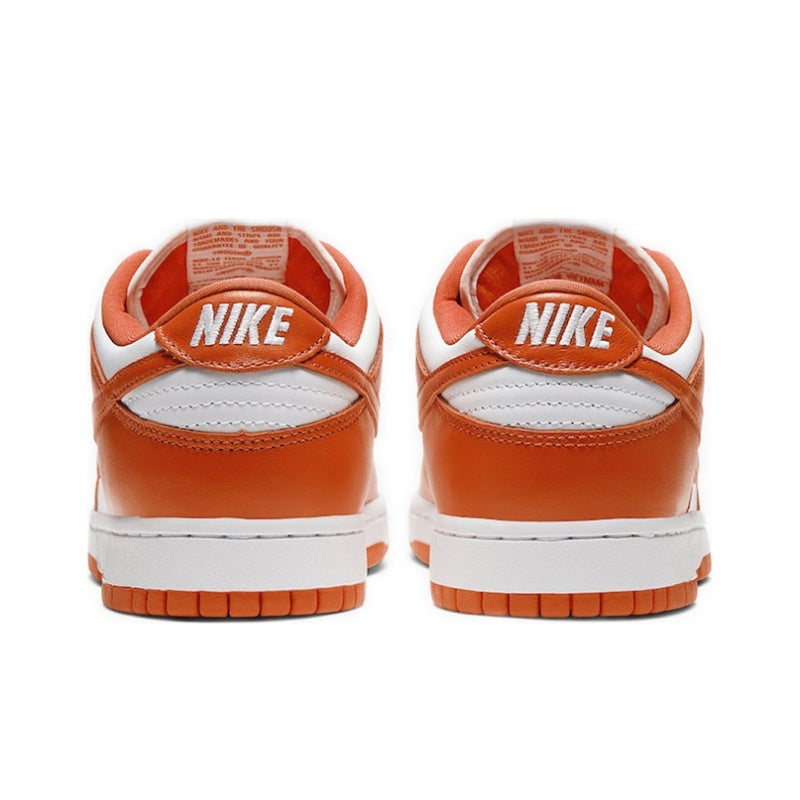 The Nike Dunk Low Syracuse is a popular sneaker that pays homage to the Syracuse University basketball team. The shoe features a vibrant orange and white colorway, with a white leather upper and orange overlays on the toe box, heel, and Nike Swoosh. The design is finished with an orange outsole and white midsole for added contrast. The Nike Dunk Low Syracuse has become a highly sought-after sneaker due to its eye-catching design and ties to one of college basketball's most storied programs.