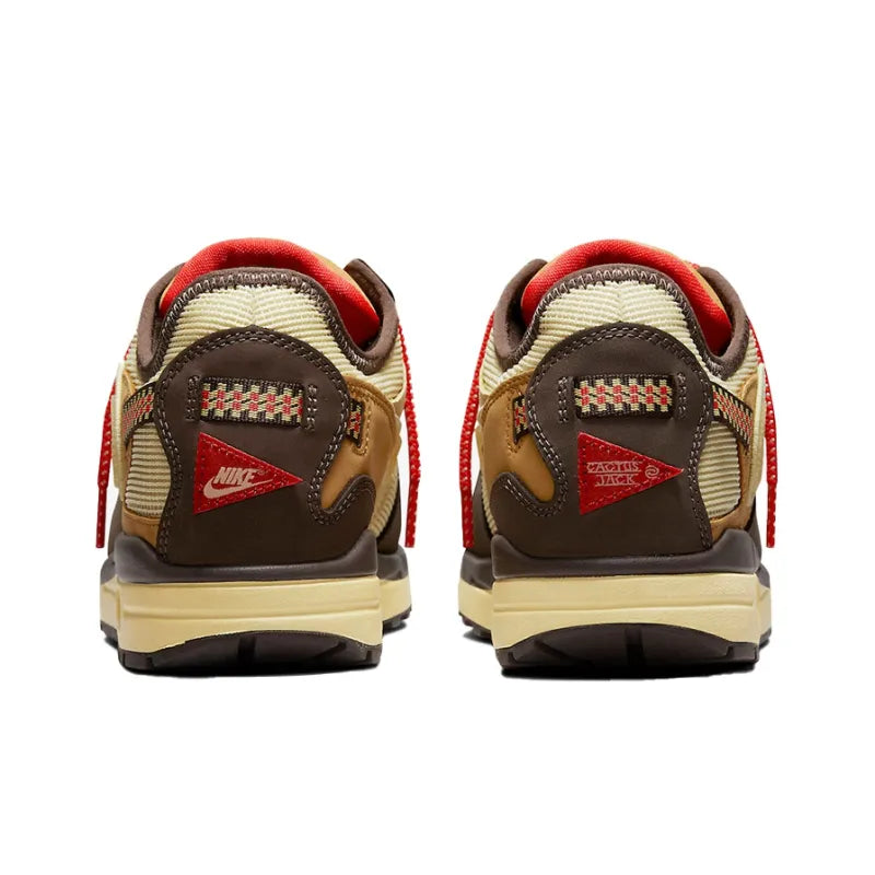 In collaboration with Travis Scott's record label Cactus Jack, the Nike Air Max 1 Travis Scott Cactus Jack Brown draws inspiration from the Nike ACG Pocket Knife hiking shoe. It features a layered mesh upper with tonal-brown Durabuck overlays and reversed Swoosh logos. A drawstring Gillie lacing system nods to common features on trail runners. At the base, a yellowed sole with a cloudy Air unit completes the design.