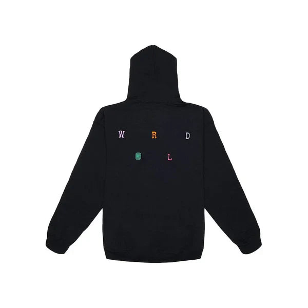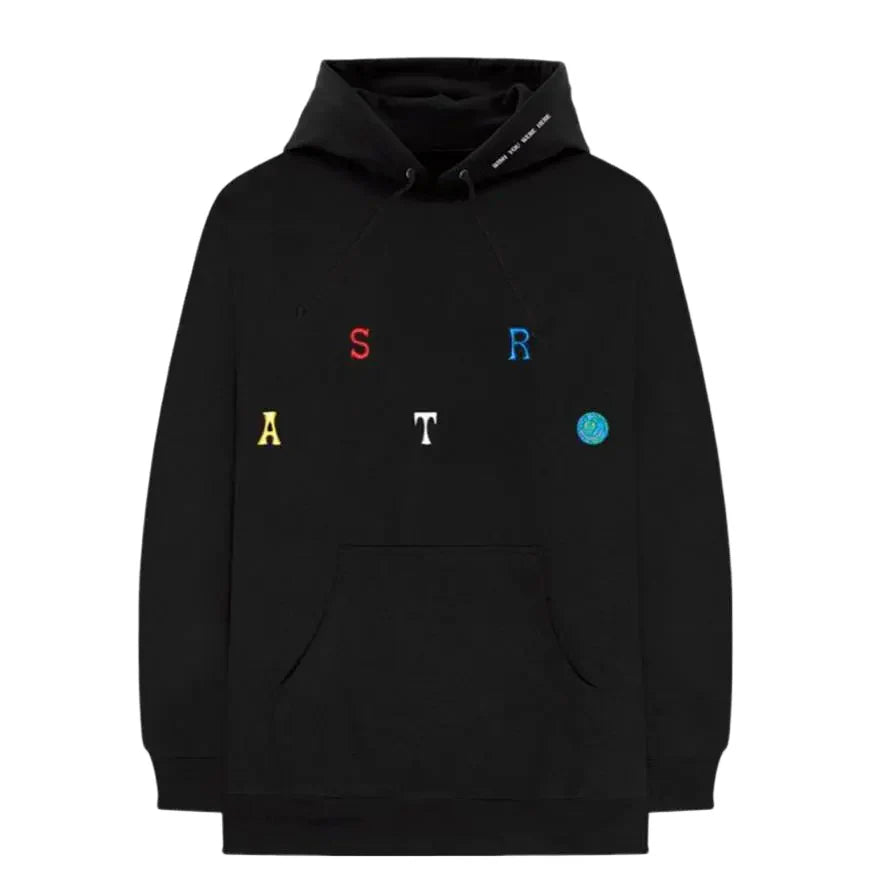 Released as part of the Fall/Winter 2018 Collection, the Travis Scott Astroworld Scattered Hoodie Black is made with a black polyester and fleece material and features multicolored accents throughout the design. The front of the hoodie features "Astro" in separate letters of blue, red, and yellow, with a small earth graphic standing in for the "o" letter. The back of the hoodie includes the same color scheme but swaps out "Astro" for "world" lettering in various purple and orange hues.