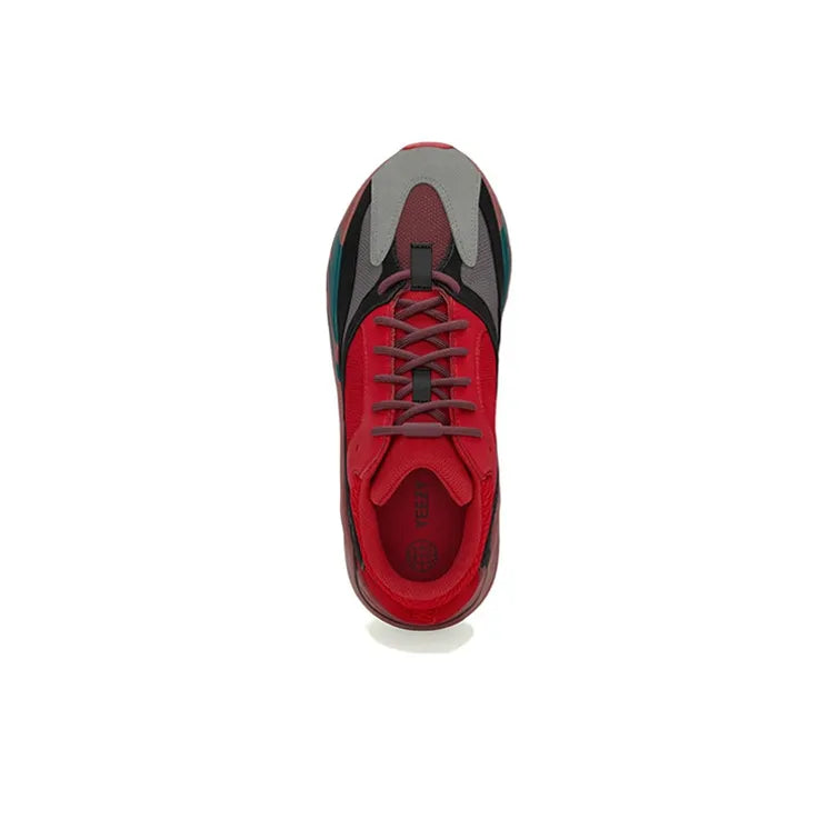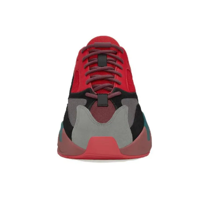 The adidas Yeezy 700 Hi-Res Red arrives with a bright red mesh and suede upper with black and grey suede overlays at the toe. In a different style from the original Yeezy 700s, the design opts for a fully circular lacing system,