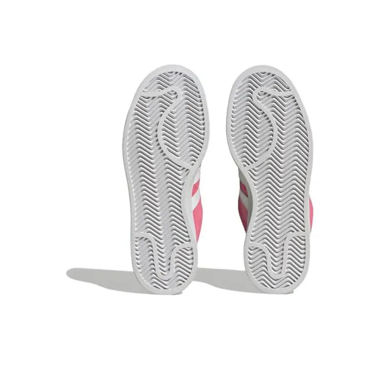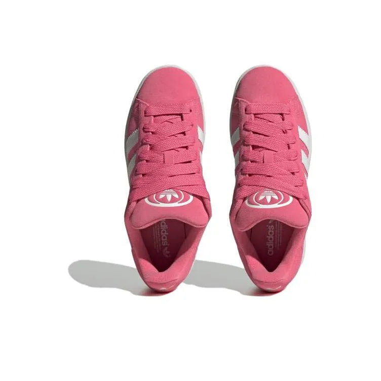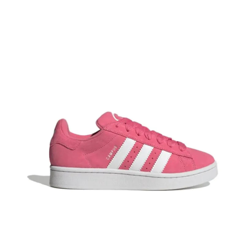 A pink fusion colorway is dominantly featured on the adidas Campus 00s for women. It first appears the suede material present on the suede upper of this shoe. Additionally, it is present on the quarter panels, which are adorned by zigzag-edged three adidas stripes in a cloudy white hue and debossed CAMPUS branding. The eye stay overlays are also pink, as are the laces and the well-padded tongue with an embossed Trefoil logo. The heel uses this primary color, but on the counter is a cloudy white Trefoil.