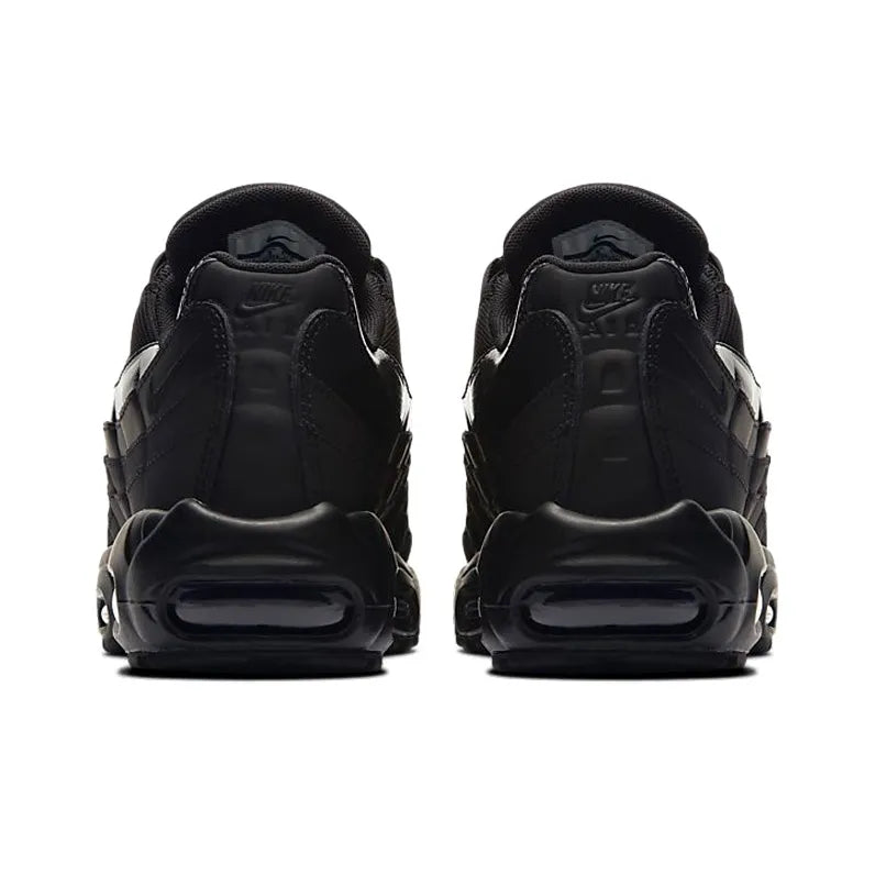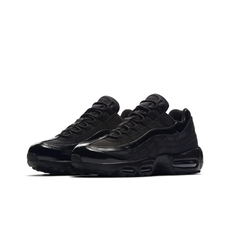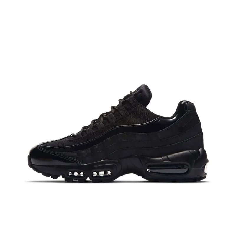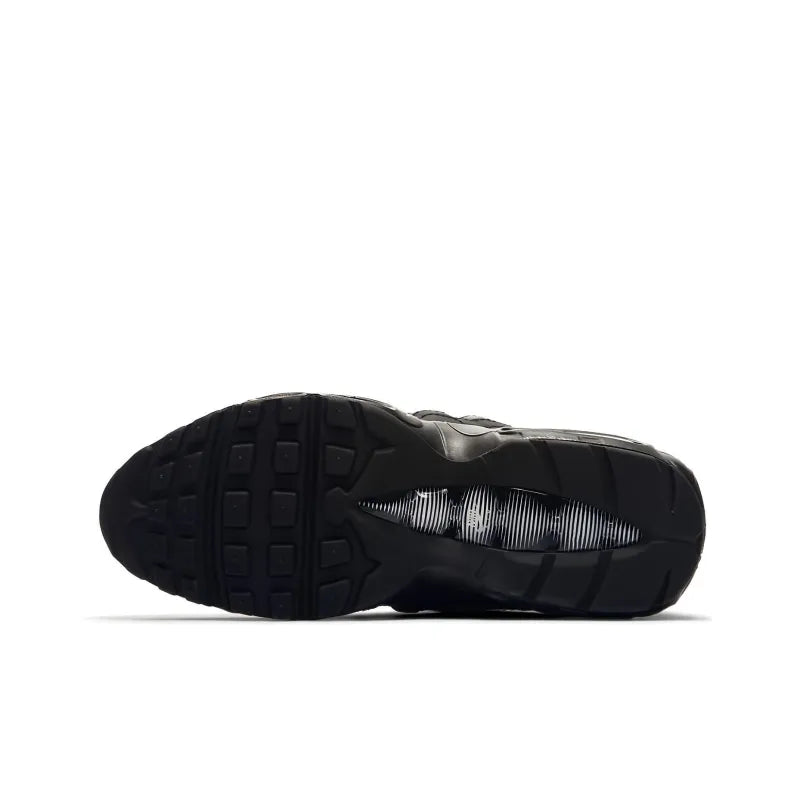 Instead of a multicolor palette, the Black Black-Black Nike Air Max 95 for women relies on a diverse range of materials and textures to define its iconic lines. The wavy overlays, a hallmark of the sneaker, blend leather, synthetic, and patent leather materials to provide textural contrast. To add a touch of reflectivity, the heel and laces feature reflective paneling in patent leather. This all-black theme extends to the foam midsole, which houses visible Max Air units and flex grooves that ensure a comfortable and cushioned stride.