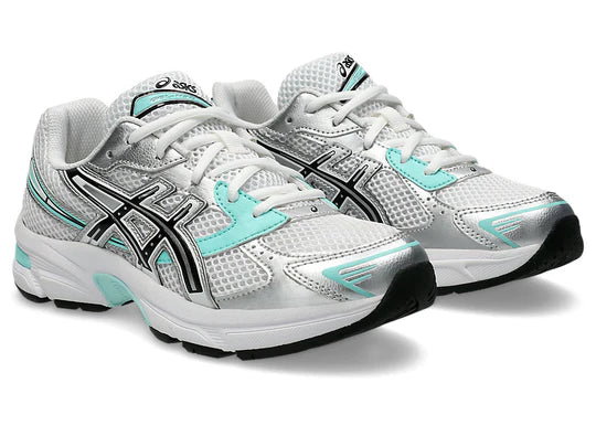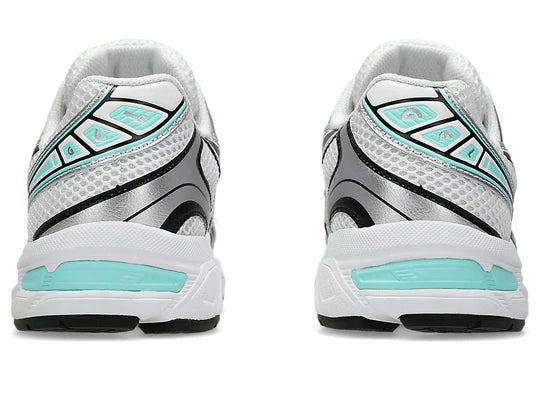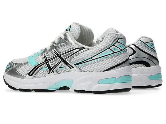 The upper construction features breathable mesh in white with a slightly loose weave. Aqua accents add splashes of color on the tongue branding, plastic pieces on the midsole, and along the upper. Like running sneakers in the ASICS catalog from the early 2000s, this shoe displays synthetic overlays with black and metallic silver stripes. In terms of technology, gel units in the midsole provide supportive cushioning and protect against impact stress. Padding around the collar and in the tongue contributes to the sneaker’s bulky, Y2K aesthetic.