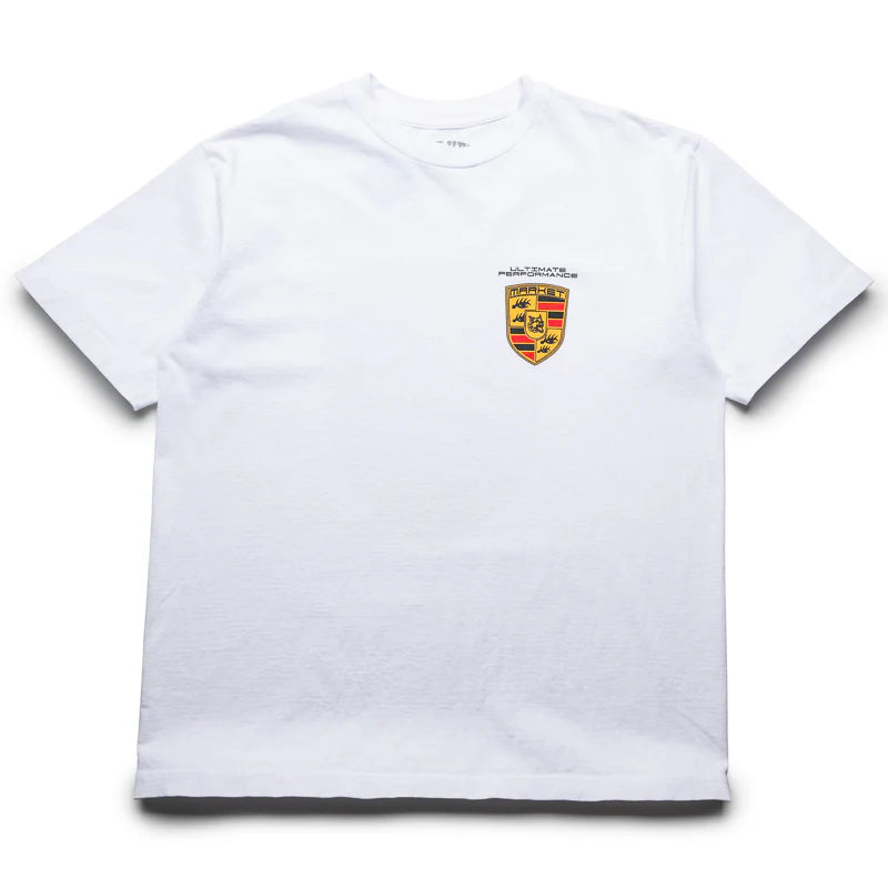 The Ultimate Badge Tee from Market is 100% Cotton, made with heavyweight fabric. The white tee has a boxy fit, featuring printed text with a custom crest logo on the left chest and back.
