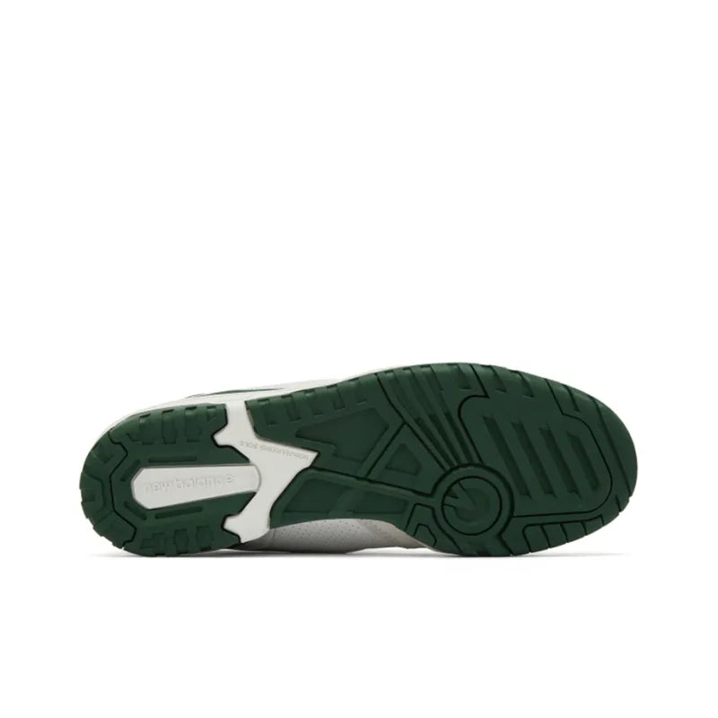The New Balance 550 White Green features a smooth white leather upper with a grey suede toe wrap and green detailing. From there, a New Balance Basketball woven tongue label and matching sole completes the design.