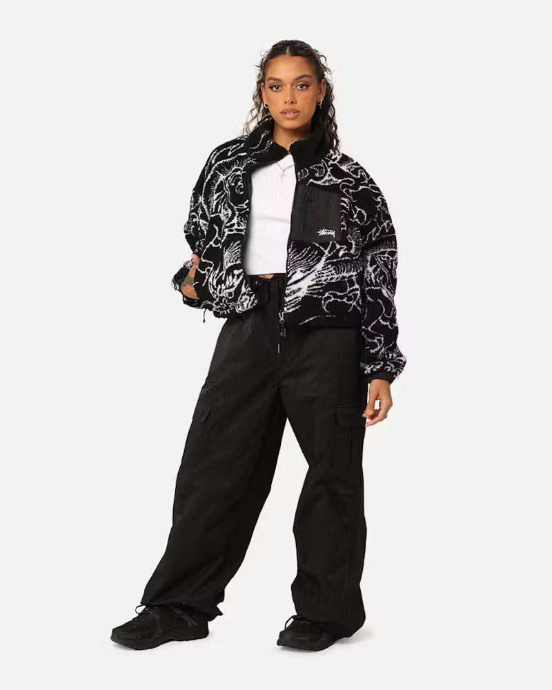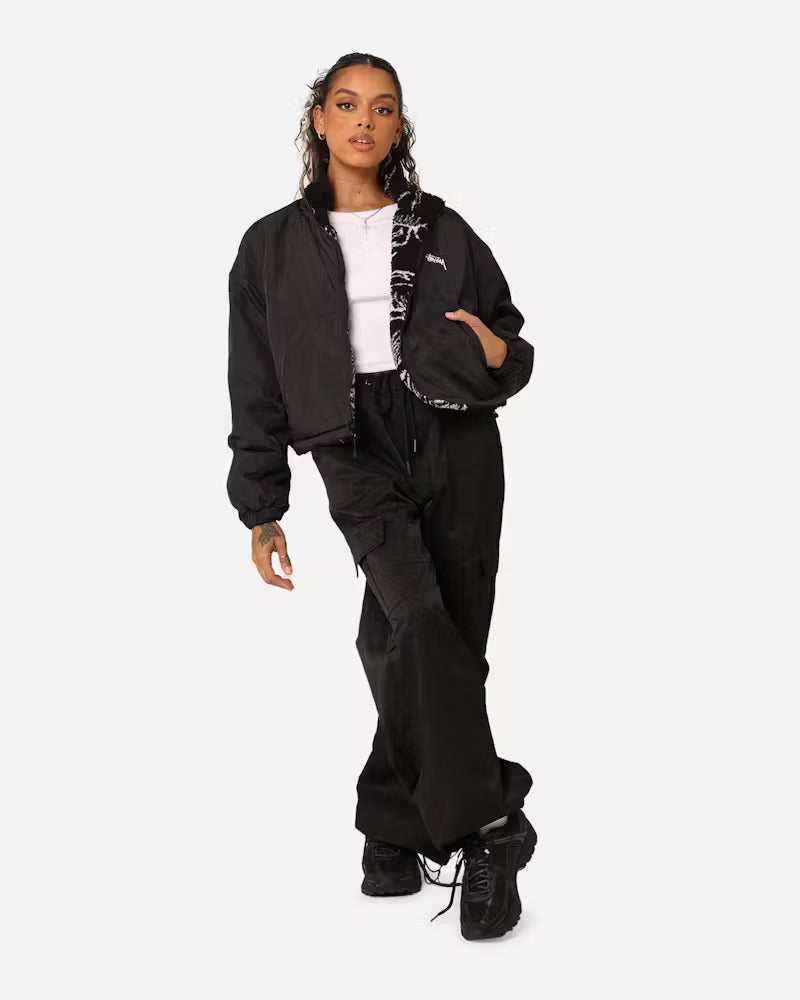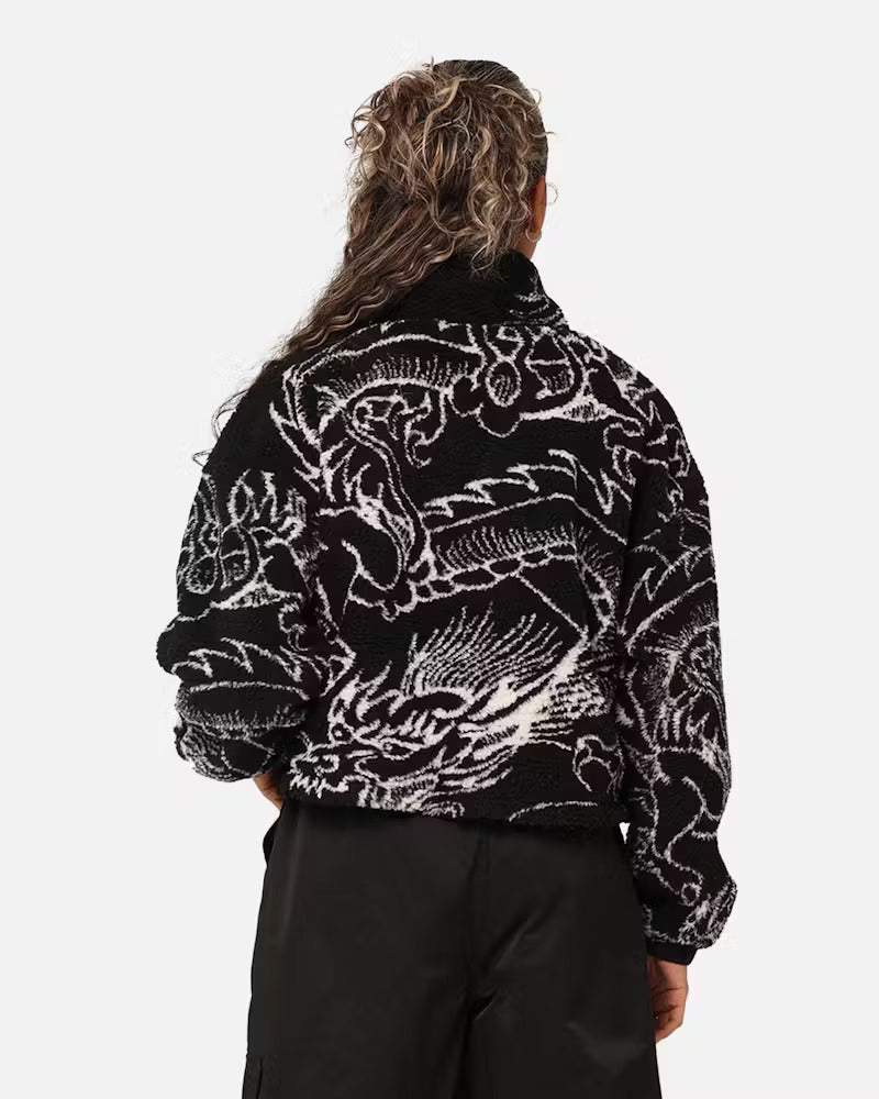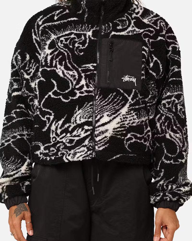 The iconic stussy reversible jacket arrivng in black and white with dragons all over