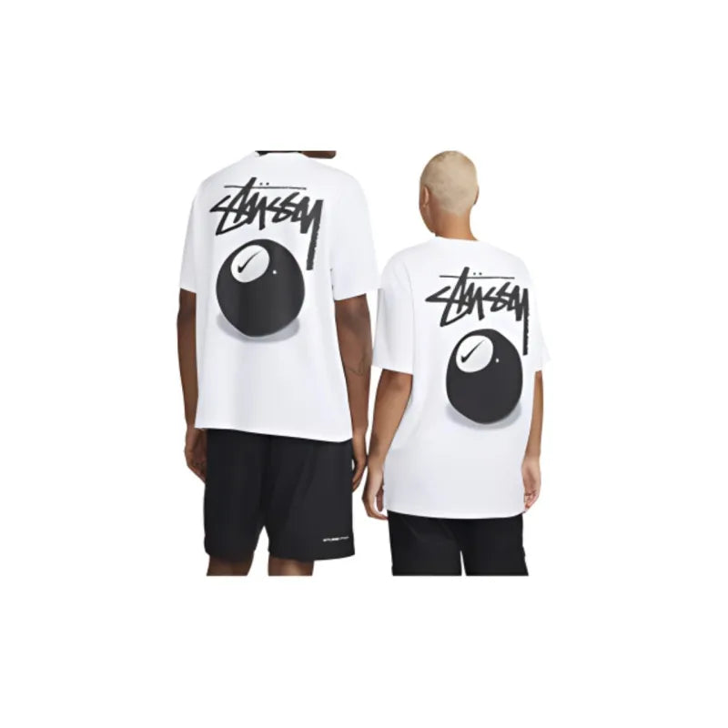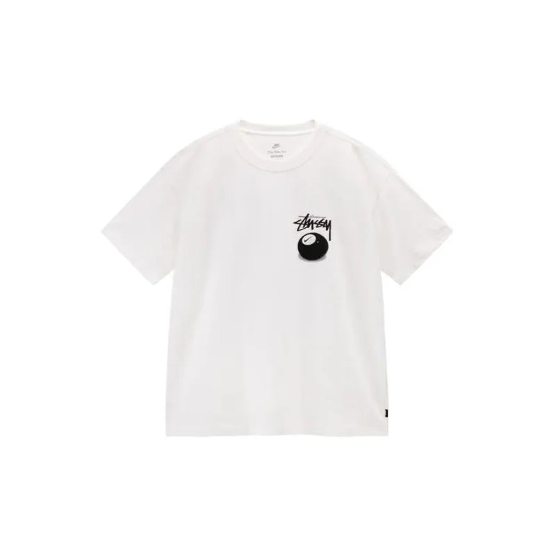 The Nike x Stussy 8 Ball T shirt Multi is a white t-shirt that has a collaborative logo on both the back and front of the t-shirt. The logo is that of the Stussy brand mark with a Nike Swoosh in the position of the number 8. The t-shirt is cotton and comes in white color. Depending on your preference, the front logo is either featured at the center or on the top left of the t-shirt.