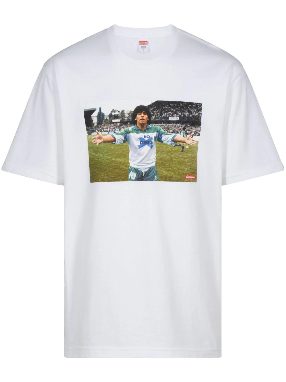 Released on February 15, 2024, as part of the Week 1 Spring/Summer 2024 Collection, the Supreme Maradona Tee in White pays tribute to the iconic footballer Diego Maradona, seamlessly blending his legendary imagery with Supreme's signature streetwear style. Crafted from premium cotton, this tee showcases a striking graphic print of Maradona's face on the front, capturing his fierce intensity and magnetic charisma. The timeless Supreme box logo is subtly integrated into the design, adding a touch of exclusivity to the garment
