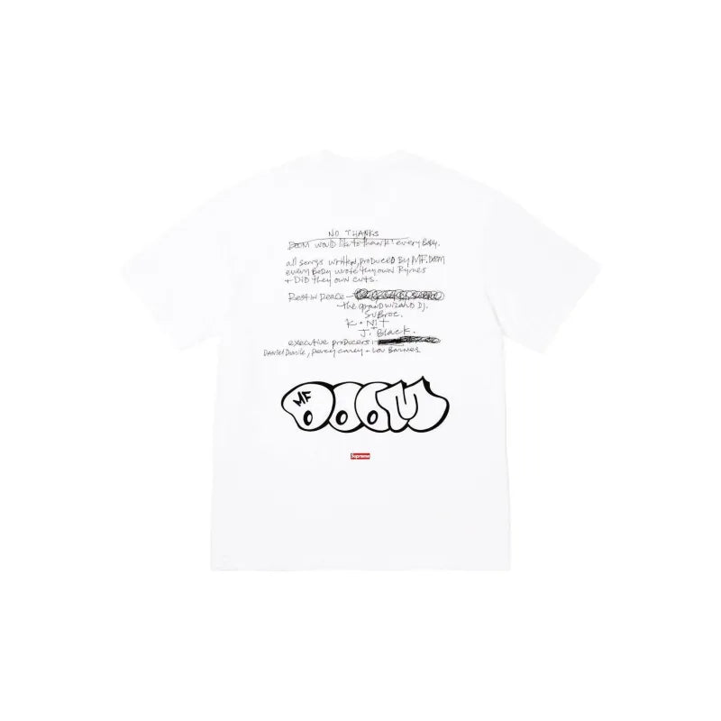 features a round neck collar with a short-sleeve design made from pure cotton. The highlight of this top is the graphic of rapper MF DOOM’s trademark mask alongside a machete sword printed at the front, and a letter from the album Operation: Doomsday printed at the back. Underneath the letter is the rapper’s name in a street graffiti font and a tiny Supreme red box logo. A branded woven neck tag completes the design.