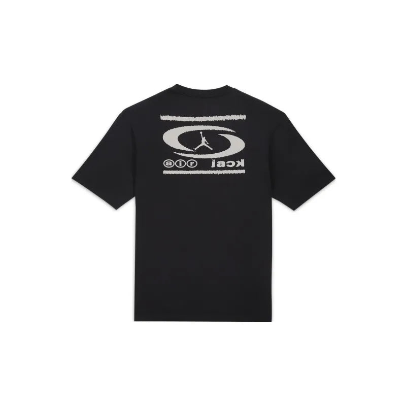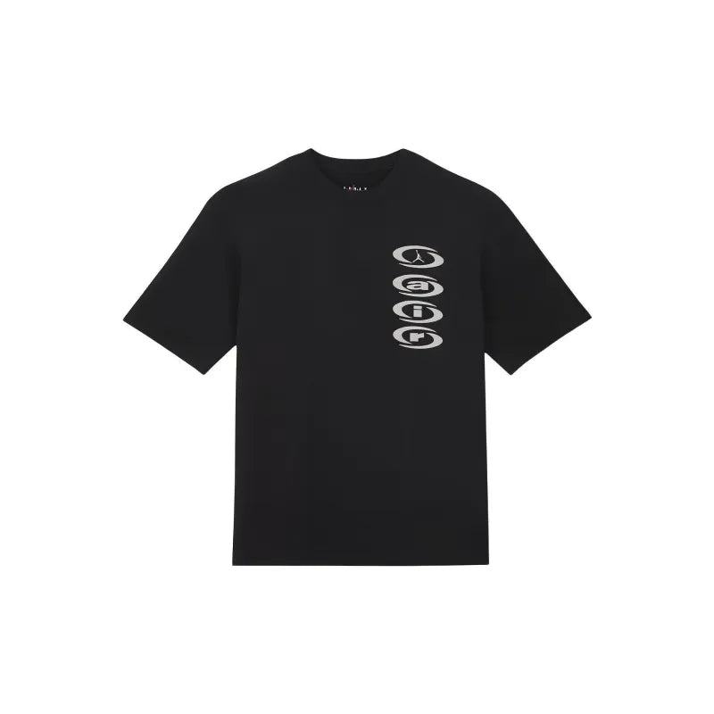 The black T-shirt by Jordan & Travis Scott features a classic design made from 100% cotton, showcasing a straightforward style with a logo on the chest. The tee's black colorway is achieved through a specialized dyeing process, ensuring a rich and consistent hue. This design aligns with the collaborative brands' focus on minimalist fashion, blending functionality with a touch of sophistication. The cotton material provides breathability and durability, so this tee can be worn every day.