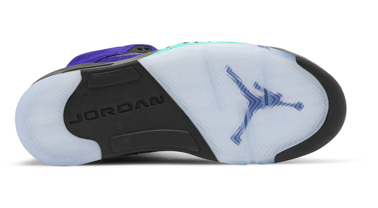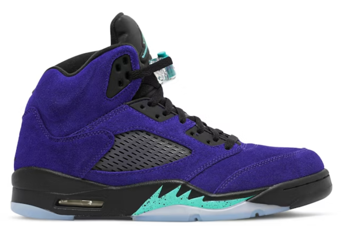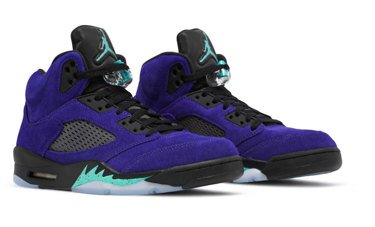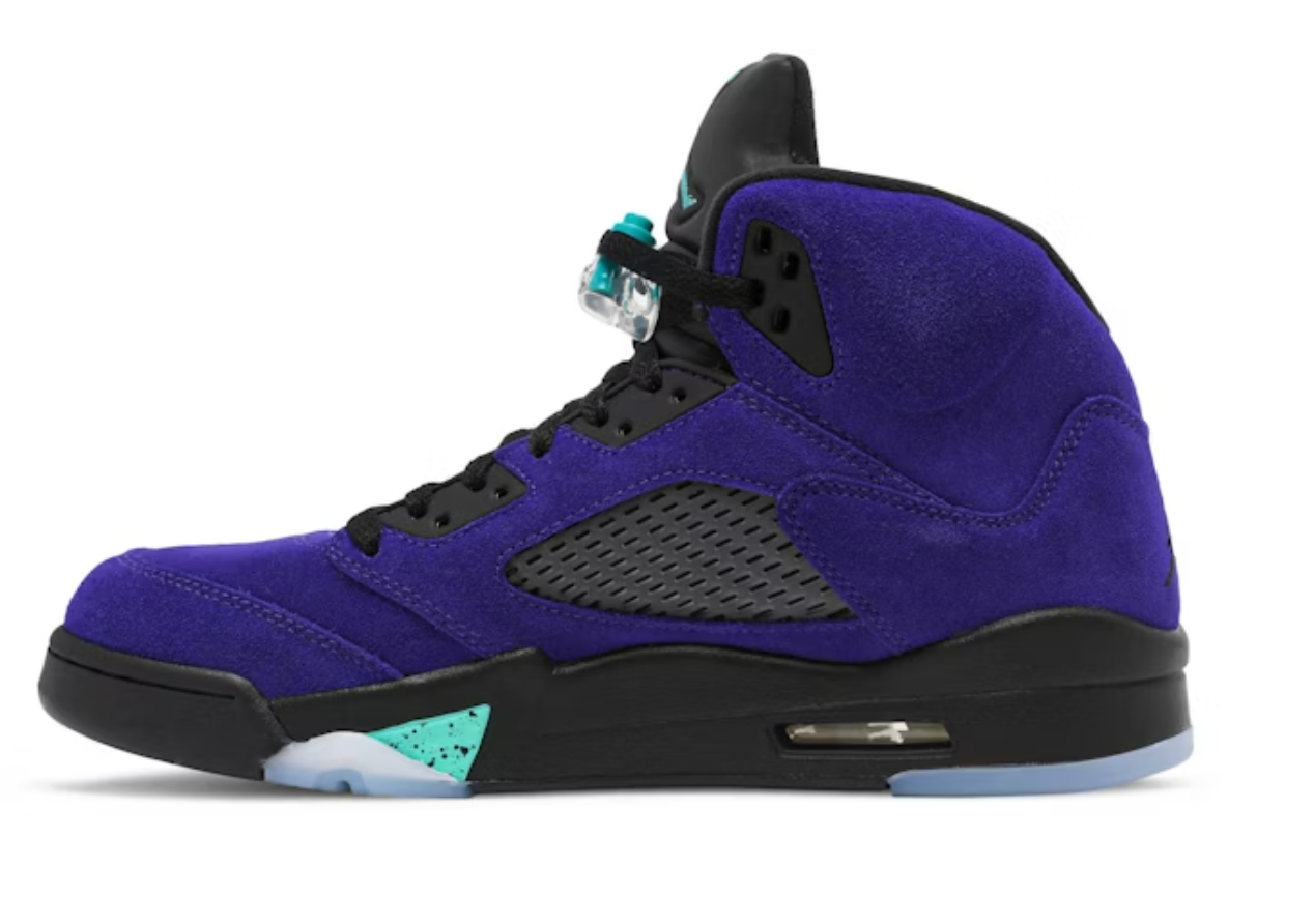 The Air Jordan 5 Retro “Alternate Grape” is a vibrant reinterpretation of one of the silhouette’s most beloved colorways. Draped in premium purple suede, the upper is accented by charcoal underlays and breathable mesh panels. Black elements on the eyestays, collar, and lacing system lend striking contrast, while aqua-green Jumpman logos on the tongue, lace toggle, and midsole “shark teeth” deliver bold details. The foam midsole integrates visible Air cushioning and a clear, icy outsole for responsive comfort and lasting traction.